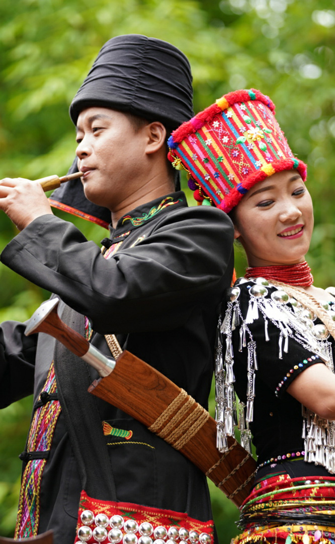 德昂族人口約1.7萬,主要分布在德宏州和保山市的潞西、梁河、瑞麗、隴川、隆陽等縣區。民居多為草排覆頂竹木結構的干欄式建筑,眼前的德昂村建筑納入了能容納數十人居住的德昂大房子,氈帽頂的小房子,還有頗具浪漫色彩的大公房、小公房……還建有“龍陽塔”標志及佛教奘房、佛塔。德昂族民間普遍信奉南傳佛教,民俗活動與佛事活動關聯緊密。潑水節、開門節、關門節是重大節日。德昂族服飾色彩豐富,口頭文學特別是民歌創作活動...